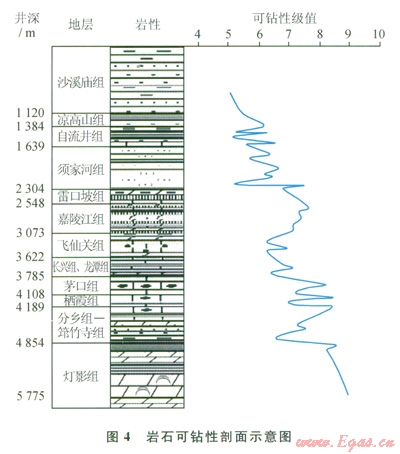 四川盆地深井—超深井鉆井提速一直是制約天然氣勘探開發(fā)的難題,氣體欠平衡鉆井、PDC鉆頭的應(yīng)用一定程度提高了深井鉆井速度,但還不能滿足國家經(jīng)濟發(fā)展對天然氣勘探開發(fā)的形勢和要求。而四川中部地區(qū)的樂山 龍女寺古隆起儲層埋藏深,垂直井深超過5000m,鉆遇地層類型多,巖性復(fù)雜,提高鉆井速度遇到以下4個方面的工程地質(zhì)難點。