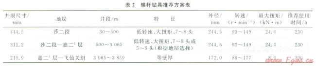 鉆井提速技術(shù)已經(jīng)廣泛應(yīng)用PDC鉆頭+螺桿鉆具的復(fù)合鉆井模式[2],螺桿的使用增加了井底鉆頭轉(zhuǎn)速從而大幅提高鉆井速度。但常規(guī)螺桿鉆具在大尺寸井段的扭矩不足,隨著井底溫度升高也會對螺桿定子橡膠產(chǎn)生影響[5-6],通過對不同井眼尺寸的螺桿鉆具應(yīng)用試驗效果進行分析,推薦了螺桿鉆具應(yīng)用的參數(shù)要求(表2),從而更好地與PDC鉆頭使用時間匹配: