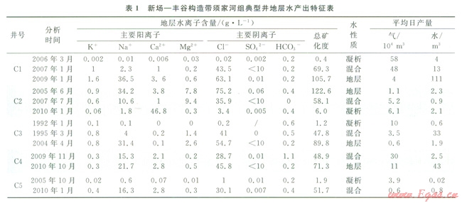 選取該區(qū)須家河組氣藏典型井進(jìn)行生產(chǎn)動(dòng)態(tài)與地層水產(chǎn)出特征綜合分析(表1)。須二段氣藏Cl井生產(chǎn)初期氣產(chǎn)量大于50×104m3/d、水產(chǎn)量小于5m3/d;C3井生產(chǎn)初期氣產(chǎn)量大于l0×104m3/d、水產(chǎn)量小于1m3/d,此時(shí)水分析總礦化度極低,分布在0.094~2.694g/L,產(chǎn)出水為氣藏凝析水;之后氣產(chǎn)量降低,水產(chǎn)量增加,產(chǎn)出水從混合水變?yōu)榈貙铀?span lang="EN-US">C2井情況相反,2007年氣藏未打開之前,氣、水產(chǎn)量均不高,產(chǎn)出水礦化度較高,2007年之后儲(chǔ)層改造獲得成功,獲5×104~6×104m3/d的天然氣產(chǎn)能,產(chǎn)出水總礦化度隨著時(shí)間的推移不斷降低,可見地層水中凝析水的混合逐漸增多。