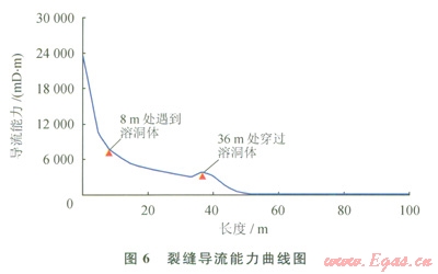 利用實驗確定了典型地質體的響應特征,以該響應特征為依據(jù)對實際井數(shù)據(jù)進行解釋,建立一系列的特征圖集或解釋圖版,在后續(xù)生產(chǎn)中可以用圖版對測井資料進行解釋[12-13]。圖4是塔里木油田A井的一段碳酸鹽巖段綜合解釋成果圖。從圖中可以看出XX20~XX30m井段,成像測井在XX26m解釋一條40cm高的裂縫,孔隙度小于1.8%,電阻率大于1000W·m,綜合評價為Ⅲ類儲集層,開井流動曲線呈一條直線,關井壓力恢復緩慢,壓力歷史曲線反映測試層為特低滲透性儲集層,僅從常規(guī)分析這類儲集層即使酸化壓裂也不會獲得工業(yè)油氣流。而對應遠探測成像圖上可以看出在XX20~XX28m距井壁3~10m的地方發(fā)現(xiàn)反射信息比較明顯,為雙邊成像,同相軸幾乎為直線,但兩側的同相軸延長線在在一條線上,裂縫角度較高,根據(jù)圖版可以評價為高角度井旁裂縫。建議中國石油塔里木油田公司勘探公司進行試油,該建議被采納,酸壓后6mm油嘴日產(chǎn)氣l0多萬立方米、油l0多立方米。從圖5酸壓施工曲線分析,擠膠凝酸注入過程壓力平穩(wěn)上升,人造裂縫正常延伸,沒有溝通儲層縫、洞的跡象;再次擠膠凝酸后,壓力有明顯下降,說明溝通了縫洞系統(tǒng)。從圖6裂縫導流能力曲線圖上分析在裂縫延伸方向8m處遇到溶洞區(qū),在36m處穿過溶洞區(qū)。證實遠探測聲波反射波成像解釋是正確的。