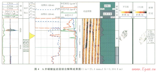 摘 要:為了有效地對碳酸鹽巖儲層進行測井評價,針對其非均質性強、各向異性大、裂縫發(fā)育、測井解釋難度大的特點,中國石油渤海鉆探工程公司測井公司研發(fā)了基于遠探測聲波反射波的成像測井技術。該技術借鑒了物探的采集技術,用測井的方法實現(xiàn)了對反射波的測量。在筒述遠探測聲波反射波成像測井基本原理、儀器特點及采集基本信息的基礎上,用參數(shù)估計法對所采集的基本信息進行分析,能有效地分離反射波和模式波,壓制噪音,并進一步把反射波分離為上、下行反射波;還設計了典型的地質體的模擬實驗,確定了不同地質體的上、下行反射波的響應特征,從而達到以實驗響應特征為依據(jù)對實際測井資料進行解釋的目的,可發(fā)現(xiàn)常規(guī)測井探測不到的儲集層。在塔里木盆地碳酸鹽巖儲層的實際應用效果表明,該技術彌補了以往測井探測深度不足的缺陷,探測深度由原來的3m提升到10m,可以為試油決策提供科學依據(jù),從而避免因常規(guī)測井探測深度不足而漏失油氣層。
