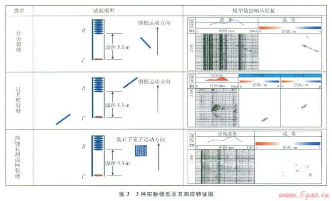 實驗過程中用2m×lm×1mm的鋼板模擬裂縫,用2m×lm×0.5m的鐵制網(wǎng)狀籠子裝上大小不等的鵝卵石模擬溶蝕孔洞,把儀器水平放入水中,保持儀器在水中靜止,模型做勻速運動,記錄一組數(shù)據(jù),據(jù)此做不同類型的模擬實驗,得到各種響應特征。圖3是在消聲水池做的3類實驗模型及其響應特征圖。圖中井旁裂縫,鋼板中心位置距儀器3m,與儀器夾角為-20°(逆時針為負,順時針為正),儀器源距為5.3m,從原始波形圖上看,反射波的傾斜同相軸非常明顯,從模型來分析這種情況只有下行波,不存在上行波,因此,在處理過程中波分離后直接進行成像,沒有進行上下行波分離,得到一組單邊的條帶狀同相軸,其形狀、走勢、夾角與模型基本一致,同相軸的中點大約為3m與鋼板距儀器的距離一致;過井壁裂縫,兩塊一樣的鋼板分別放在儀器兩側與儀器的夾角為20°,兩塊板中點都距儀器3m,從原始波形上看有兩組不同走勢的反射波,從理論分析這種情況會出現(xiàn)上下行反射波,對其進行處理并雙邊成像,可以看出在上下行反射波成像圖上各有一組條帶狀的同相軸,且兩組同相軸在一條直線上;孔洞或網(wǎng)狀縫,用三角鐵焊成2m×1×0.5m的長方形骨架,然后用的鐵絲網(wǎng)把6個面封好,里面裝上鵝卵石來模擬溶蝕孔洞,放置中心距儀器3m,從理論分析這種模型的反射是雜亂無章的,處理過程中在波分離完直接對其進行了成像沒有進行上下行波的分離,從成像圖上看呈雜亂無章的斑點狀。