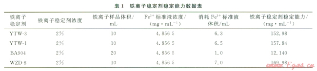 使用鐵離子穩(wěn)定劑的目的是防止酸化后鐵離子形成Fe(OH)3沉淀。評(píng)價(jià)了4種鐵離子穩(wěn)定劑有效絡(luò)合鐵離子濃度能力吲(表1)。