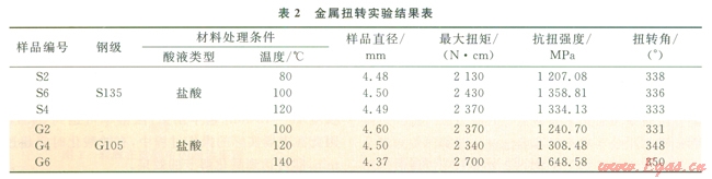 扭轉(zhuǎn)實(shí)驗(yàn)是按照國家標(biāo)準(zhǔn)GB/T l0128-2007金屬室溫扭轉(zhuǎn)試驗(yàn)方法來執(zhí)行。測(cè)試S135鋼和G105鋼在鹽酸基液中被腐蝕一定時(shí)間后力學(xué)性質(zhì),即抗扭強(qiáng)度。實(shí)驗(yàn)數(shù)據(jù)見表2所示。
