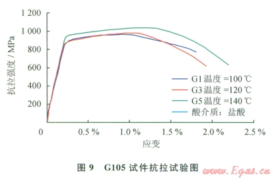 S135鋼、Gl05鋼在拉伸時(shí)應(yīng)變?cè)囼?yàn)見圖8、9,S135鋼在鹽酸中酸化后的抗拉強(qiáng)度均值為l091MPa(鉆桿APl標(biāo)準(zhǔn)要求S135最小抗拉強(qiáng)度為1000MPa);Gl05鋼在鹽酸介質(zhì)中酸化后的抗拉強(qiáng)度均值為994.8MPa(鉆桿API標(biāo)準(zhǔn)要求Gl05最小抗拉強(qiáng)度為793MPa)。因此可以看出,Sl35鋼和Gl05鋼在鹽酸中腐蝕后,抗拉強(qiáng)度仍然能滿足工程需要。