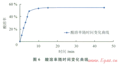 由圖6可知,隨著酸化時(shí)間的增加,酸溶率增大,反應(yīng)l0~15min基本結(jié)束,酸溶率可達(dá)到54.72%。因此在現(xiàn)場(chǎng)實(shí)際的操作過程中,有效酸化時(shí)間超過l5min,即可達(dá)到酸化解卡的效果。