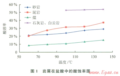 酸液對(duì)白云巖、石灰?guī)r的酸化效果最好,酸蝕率超過50%,其次是泥巖;酸液對(duì)鉆井液泥餅同樣具有一定的酸溶率,在20%~40%之間。土酸整體的酸化效果優(yōu)于鹽酸,但差距較小。溫度越高,酸化效果越好。因此,在鉆遇易酸化地層時(shí)出現(xiàn)卡鉆事故時(shí)[2],理論上采用浸泡酸化解卡液的辦法是可行的[3]。