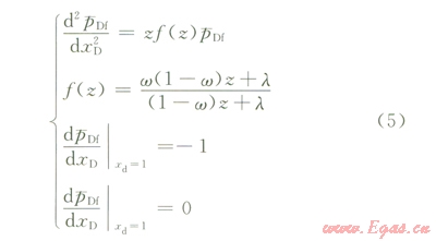 式中z為與滲流數學模型無因次時間相對應的拉普拉斯空間自變量;`RDF為拉普拉斯空間中儲層裂縫系統(tǒng)無因次壓力;w為裂縫—孔隙雙重介質儲層的儲容比,無因次;l為裂縫—孔隙雙重介質儲層的竄流系數,無因次;f(z)為綜合描述裂縫系統(tǒng)和孔隙系統(tǒng)儲滲級差關系的函數值,無因次;xD如為研究單向線性滲流問題的一維坐標系中無因次坐標值,設定氣水區(qū)交界處xD=0,水區(qū)外邊界處xD=l。