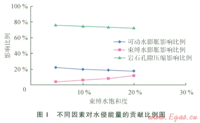 為了定量認識前述3種岡素對水侵能量的影響程度,參照開展過相關研究的實際氣藏情況,計算預測不同束縛水飽和度條件下地層壓力從原始狀態(tài)的60MPa降到l0MPa后可動水彈性膨脹、束縛水膨脹及儲層孔隙壓縮引起的體積變化在水區(qū)總體積變化巾所占比例(圖1)。結果顯示,地層壓力降低后儲層孔隙壓縮效應對水侵能量的貢獻比例最高,因此依據式(3)可得到估算極限水侵量在可動水體儲量中所占比例的近似公式。