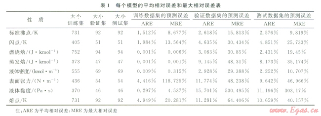 化合物的數(shù)目表明了方程式數(shù)目,而分子描述符的數(shù)目則表明了系數(shù)數(shù)目。因此,化合物數(shù)目超出分子描述符數(shù)目的比率越小,ANN就能在“訓(xùn)練”集中表現(xiàn)得越好。不過,對不在“訓(xùn)練”集內(nèi)的化合物來說,以這種方法構(gòu)建的ANN無法保證其預(yù)測水平。舉例來說(如表l所示),對于所構(gòu)建的蒸發(fā)焓或燃燒焓模型而言,“測試”集的平均相對誤差遠(yuǎn)遠(yuǎn)大于“訓(xùn)練”集的平均相對誤差。解決此問題的一個可能方案是采用PCA[8]:用PCA來處理描述符,然后找到得分,取前30列的得分(含上述信息99%的內(nèi)容),最后按照上述步驟構(gòu)建一個新的ANN。