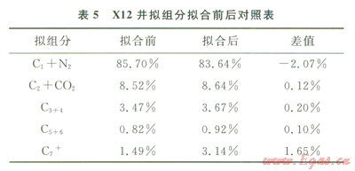 根據(jù)相態(tài)恢復(fù)理論,利用數(shù)值模擬軟件Eclipse中的高壓物性分析模型(PVTi),選取取樣時(shí)間早、相平衡較好的Xl2井的高壓物性實(shí)驗(yàn)數(shù)據(jù)進(jìn)行相態(tài)恢復(fù)。首先,對(duì)原始PVT數(shù)據(jù)進(jìn)行模擬形成臨界參數(shù)場;然后,在目前壓力下,向平衡凝析氣中逐漸加入少量平衡油,再計(jì)算露點(diǎn)壓力,若計(jì)算的露點(diǎn)壓力低于地層壓力,則繼續(xù)在新的露點(diǎn)壓力下加入該壓力下的平衡油,直到露點(diǎn)壓力恢復(fù)到原始地層壓力?;謴?fù)到原始地層壓力下的流體組分,可以代表原始?xì)獠貤l件下的流體。相態(tài)恢復(fù)前后對(duì)照表表明,相態(tài)恢復(fù)后潛在凝析油含量C5+提高了1.75%,凝析油含量達(dá)到2499/m3(表5)。通過相態(tài)恢復(fù)模擬飽和凝析氣藏地層流體高壓物性特征,為開發(fā)技術(shù)政策制定和氣藏動(dòng)態(tài)預(yù)測奠定了基礎(chǔ)。