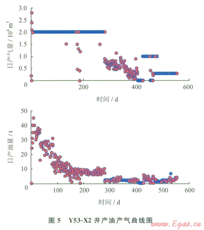 選取產(chǎn)油量最高的Y53-X2氣井進(jìn)行分析,該井投產(chǎn)第一個(gè)月,平均日產(chǎn)氣2.04×104 m3,平均日產(chǎn)油35.27t,油氣比達(dá)到l7.29t/104m3,產(chǎn)出油密度0.8055g/cm3,含蠟量l3.63%,屬于原油。在實(shí)驗(yàn)室測得Y53-X2井原始地層條件下飽和油的氣油比為216.49m3/m3,飽和凝析氣氣油比為4883.75 m3/m3,結(jié)合實(shí)際生產(chǎn)過程中產(chǎn)出流體的油氣比,計(jì)算該井不同時(shí)間產(chǎn)出天然氣與產(chǎn)出原油在地下的體積比(表4),結(jié)果表明產(chǎn)出流體中原油的比例迅速降低,表現(xiàn)為局部聚集原油的特征。Y53-X2井采氣曲線也表明隨著生產(chǎn)的進(jìn)行,產(chǎn)出原油迅速下降,該井投產(chǎn)279d后,氣產(chǎn)量基本保持2×104m3/d,油產(chǎn)鰱從初期的45t/d降至2.0t/d(圖5),油產(chǎn)量及油氣比迅速下降,同樣說明井底附近原油有限。
