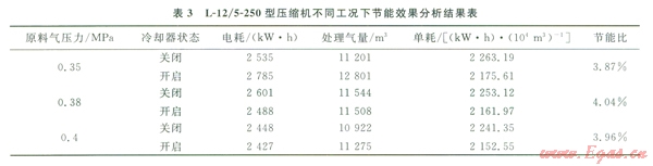 2)結(jié)合現(xiàn)場條件,對L-125-250型壓縮機(jī)第二、四級級間回氣管上加裝冷卻器后,在0.350.38、0.40Mpa3種進(jìn)氣壓力下取得的對應(yīng)節(jié)能比分別為3.87%、4.04%、3.96%,驗證了該節(jié)能技術(shù)的可行性。