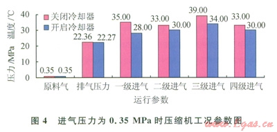 從表2的數(shù)據(jù)可看出,當(dāng)進(jìn)氣壓力為0.35 MPa時開啟冷卻器后壓縮機(jī)一級進(jìn)氣溫度由35℃降低到28℃,溫度下降了7℃,其他參數(shù)對比分析如圖4所示??傊诓煌M(jìn)氣壓力下,開啟冷卻器后壓縮機(jī)各級進(jìn)氣溫度都有所下降,對第二、四級級間回氣的冷卻取得了降低壓縮機(jī)進(jìn)氣溫度的效果。