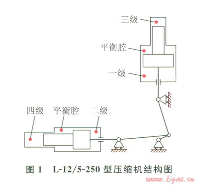 CNG加氣站一般由天然氣預(yù)處理、壓縮、儲存、控制以及CNG售氣等5個系統(tǒng)組成[3]。CNG壓縮機(jī)是壓縮系統(tǒng)的核心部分,一般為多級壓縮,采用中間冷卻與分離方式降溫、脫液[4]。某加氣站采用2L-1e5—250型壓縮機(jī),為2列四級壓縮(一、三級在豎直列,二、四級在水平列),中間冷卻,有油潤滑,氣缸和中間冷卻器為水冷結(jié)構(gòu),具有運(yùn)轉(zhuǎn)平穩(wěn)、排氣量大、適用范圍廣、維護(hù)費用低等優(yōu)勢[5-6]。由于采用了級差式壓縮缸結(jié)構(gòu),同列壓縮缸壓力差別較大,氣體作用力差別較大,為了改善活塞桿的受力狀態(tài)和減小電機(jī)的負(fù)荷,在同列壓縮缸中間設(shè)有平衡腔來平衡活塞力[7]。L-125-250型壓縮機(jī)結(jié)構(gòu)如圖l所示,其額定功率為126kw,排氣量為12m3min,進(jìn)氣壓力為0.5MPa,排氣壓力為25Mpa[8]。