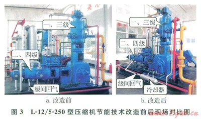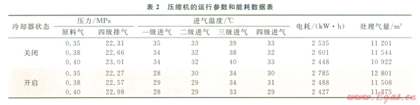 基于上述的節(jié)能技術(shù)原理,由于現(xiàn)場條件的限制,本次改造僅僅在L-125-250型壓縮機(jī)第二、四級級間回氣管線上加裝了一套冷卻器,冷卻器換熱面積為1.5,改造前后現(xiàn)場如圖3所示。為了系統(tǒng)分析節(jié)能改造的節(jié)能效果,在不改變冷卻系統(tǒng)和壓縮機(jī)系統(tǒng)其他設(shè)備參數(shù)的條件下,通過系統(tǒng)原有壓力、溫度、氣量、電耗等記錄儀表,分別測試了原料氣進(jìn)氣壓力為0.35、0.380.40MPa下關(guān)閉和開啟冷卻器時壓縮機(jī)的運(yùn)行參數(shù)和能耗,相關(guān)數(shù)據(jù)見表1、2