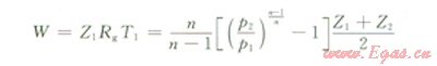 式中W為單位質(zhì)量天然氣的理論壓縮功,kJkg;Z1、Z2為進(jìn)、排氣壓力下的氣體壓縮性系數(shù);Rg為氣體常數(shù),kJ(kg·K);T1為壓縮缸進(jìn)氣溫度,K;n為壓縮過程多變指數(shù);P1、P2為壓縮缸進(jìn)、排氣壓力,MPa。