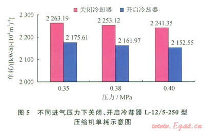 節(jié)能考核指標(biāo)為壓縮機(jī)壓縮單位體積的天然氣所需的能耗,即單耗。通過以上能耗數(shù)據(jù)對比分析得出關(guān)閉和開啟冷卻器時壓縮機(jī)組在不同進(jìn)氣壓力下的單耗,分析該節(jié)能技術(shù)的節(jié)能效果。在原料氣進(jìn)氣壓力為0.35、0.38、0.40MPa時,分別取得了節(jié)能比為3.87%、4.04%、3.96%的節(jié)能效果。相關(guān)工況的節(jié)能效果分析結(jié)果見表3,改造前后壓縮機(jī)單耗對比分析如圖5所示。