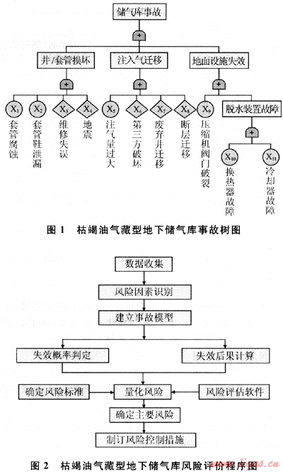 枯竭油氣藏型地下儲氣庫的安全問題至關(guān)重要,其風(fēng)險是多方面的,與儲氣庫的規(guī)劃、設(shè)計、施工、運營、維護以及檢修的各過程密切相關(guān)。因此必須從系統(tǒng)安全的角度出發(fā),在儲氣庫事故資料統(tǒng)計分析的基礎(chǔ)上,借鑒輸氣管道風(fēng)險評價方法,結(jié)合儲氣庫特點對系統(tǒng)中潛在風(fēng)險因素進行初步分類,將其劃分為12大類、33小類,并建立事故樹進行主要風(fēng)險因素識別,進一步利用事故模型判斷系統(tǒng)發(fā)生事故的可能性及其危害程度,確定其風(fēng)險大小,建立相應(yīng)的風(fēng)險評價程序,為制訂風(fēng)險防范措施和安全管理決策提供科學(xué)依據(jù)。