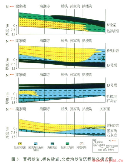 3套典型砂巖體的沉積表明了北部地勢的坳隆和沉降幅度的反復變化,也表明陸表海環(huán)境下大型河流快速侵入并持續(xù)沉積的存在。晉祠砂巖沉積時期,地勢北高南低,河流由北向南快速侵入,主干河道發(fā)育在研究區(qū)北部和中東部;隨后北部地勢沉降幅度變大,沉積的扒樓溝石灰?guī)r表明了海域中心向北的遷移,地勢也相應南高北低;之上發(fā)育了在該區(qū)和整個鄂爾多斯盆地東緣廣泛分布的13號煤層,在13號煤層的泥炭沼澤沉積之時,北部地勢仍略低,但受廣泛的泥炭沼澤堆積影響,地勢已經(jīng)接近平緩;橋頭砂巖沉積時期的河流再次由北向南沖積,大型的河流對下部的泥炭沼澤起沖刷作用,此時地勢轉(zhuǎn)變?yōu)楸备吣系?;隨后陸表海海水的再次侵入和11號、12號煤層成煤沼澤的堆積在一定程度上又減緩了北部隆起的趨勢;北岔溝砂巖河流沉積的影響范圍較前兩次進一步擴大,往南延伸到三交、柳林地區(qū),北部地勢進一步隆起,泥炭沼澤逐漸向南轉(zhuǎn)移(圖3)。