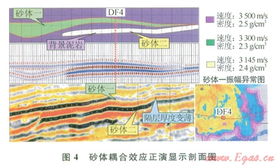 利用正演模型研究隔層厚度對儲層干涉耦合的影響,結(jié)果顯示:當(dāng)隔層厚度低于地震分辨率時,下伏砂體的振幅會隨泥巖隔層的厚度變薄而變??;而當(dāng)泥巖隔層厚度增大到地震分辨率時會對下伏砂體振幅起到增強(qiáng)作用。在不知砂體間實(shí)際受耦合效應(yīng)影響程度的時候,主要采取針對特殊目標(biāo)層的地震正演研究來解決這一影響因素。如圖4所示,砂體邊部振幅逐漸減弱為砂體厚度逐漸減薄與隔層厚度逐漸減薄的綜合影響,所以不能以該區(qū)域較弱振幅否認(rèn)砂體邊緣部位含氣性。同時該研究也顯示,當(dāng)砂體厚度低于5m時,如果泥巖隔層較薄,則頂面反射顯示砂體過早尖滅,造成砂體地震解釋范圍比實(shí)際展布范圍小。所以是砂體間耦合效應(yīng)對地震反射的影響程度主要取決于地震資料分辨率。