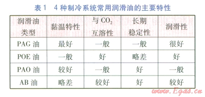 目前,制冷系統(tǒng)常用的潤滑油包括PAG油(聚亞烴基乙二醇油)、POE油(脂類油)、PAO油(聚α-聚烴油)、AB油(烷基苯類油)等[11],主要特性見表1。
