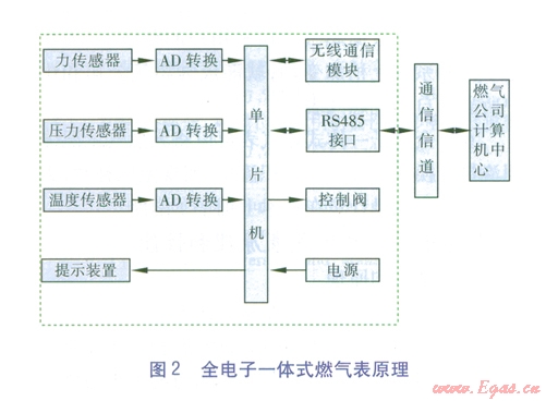 壓力傳感器、溫度傳感器、力傳感器的模擬信號(hào)經(jīng)AD轉(zhuǎn)換后傳給單片機(jī),單片機(jī)加以處理后發(fā)送給提示裝置(液晶屏、發(fā)光管和蜂鳴器)以提示用戶,并可向控制閥發(fā)出指令以實(shí)現(xiàn)通斷功能。通過通信接口(RS485)將計(jì)量數(shù)據(jù)通過通信信道發(fā)送到燃?xì)夤镜挠?jì)算機(jī)中心,或通過無線通信模塊以無線傳輸?shù)姆绞桨l(fā)送到燃?xì)夤镜挠?jì)算機(jī)中心,并接受計(jì)算機(jī)中心發(fā)出的指令實(shí)現(xiàn)控制功能。全電子一體式燃?xì)獗碓硪妶D2。