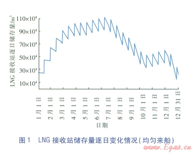 本方法綜合考慮目標(biāo)天然氣市場用氣需求情況、用氣特性、上游LNG來船情況,LNG接收站天然氣外輸量、LNG船卸載量、站內(nèi)LNG儲存量等指標(biāo)采用計(jì)算機(jī)編程進(jìn)行動態(tài)分析,得出在均勻來船的情況下LNG接收站儲存規(guī)模、LNG接收站儲存量每日變化情況、LNG作為調(diào)峰的主力氣源時其所需要的儲罐數(shù)量及船期等情況。該動態(tài)分析方法還可以通過調(diào)整上游LNG運(yùn)輸鏈中LNG船的船期用于“平谷抑峰”,既保障下游供氣和調(diào)峰的要求,又可以降低LNG接收站儲存規(guī)模,減少站內(nèi)LNG儲罐數(shù)量,減少LNG接收站投資。