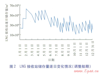 假設(shè)該LNG接收站LNG設(shè)計(jì)儲存規(guī)模為64×104m3 (4座16×104m3LNG儲罐),通過動態(tài)分析方法計(jì)算結(jié)果可知,每年需調(diào)整LNG船的船期,其中:2、3、5月份需各減少接收l船LNG;8、9、12月份需各增加接收l船LNG;其余月份仍保持每月接收2船LNG不變。通過調(diào)整船期方法得到的LNG接收站儲存量逐日變化情況見圖2.
