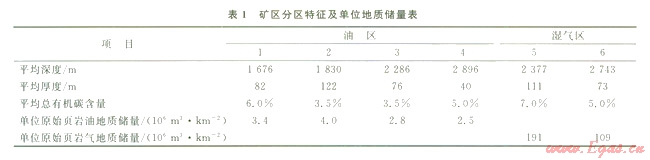 根據(jù)頁巖有機(jī)質(zhì)成熟度,參考已知油田的油密度和油氣比,先把礦區(qū)劃分成3個(gè)大區(qū)即頁巖油區(qū)(Ro介于0.7%~l.1%),濕氣區(qū)(Ro介于1.1%~1.5%),干氣區(qū)(Ro>1.5%)(圖2)。再根據(jù)其他“五度”特征劃分(表1),頁巖油區(qū)分為4個(gè)區(qū),濕氣區(qū)分為2個(gè)區(qū),沒有干氣區(qū)。根據(jù)井點(diǎn)資料和各區(qū)的“五度”特征,計(jì)算代表該區(qū)平均單位頁巖油、溶解氣和油氣當(dāng)量的地質(zhì)儲量,再根據(jù)各區(qū)面積乘以單位地質(zhì)儲量即得到該區(qū)總的頁巖油、溶解氣和油氣當(dāng)量的地質(zhì)儲量,同理得氣區(qū)的游離氣、吸附氣和總天然氣地質(zhì)儲量。通過一年近300口井鉆探的證實(shí),上述分區(qū)合理,預(yù)測儲量與實(shí)際地質(zhì)儲量相差不大。