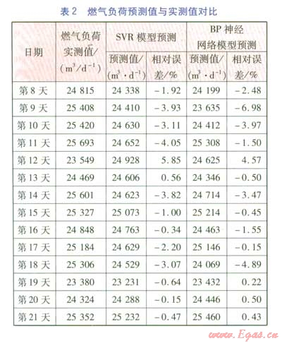 選擇某城市21天的燃氣負荷數據,初始訓練樣本為前7天的負荷數據(見表l),利用SVR預測第8天的燃氣負荷,然后將第8天的實測負荷并入初始訓練樣本,再利用SVR預測第9天的燃氣負荷,以此類推,可以得到第8天至第21天的燃氣負荷預測值及相對誤差(見表2)。
