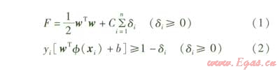 優(yōu)化的目標函數為F=wTw,目標函數F可以保證分類的最優(yōu)性,約束條件(2)則保證分類的正確性。為了消除異常樣本的影響,引入松弛變量δi,相應的目標函數可以表示為: