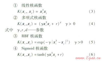 SVM中最常用的幾種核函數見式(3)(6),其中線性核函數可以看作是多項式核函數的一種特殊情況。