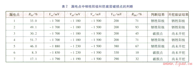如果RIRC大于等于0.6,則可判斷此處金屬表面防腐層的電阻很小,預(yù)測(cè)為犧牲陽(yáng)極;如果RIRC>1,則不排除此處管道上伴隨有防腐層破損情況;如果RIRC小于0.6,則表明此處金屬表面防腐層的絕緣電阻還比較大,可以判斷為防腐層破損。此處的0.6是一個(gè)經(jīng)驗(yàn)性數(shù)值,按此判斷是否精準(zhǔn),還需要更多的實(shí)踐來證實(shí)。根據(jù)此方法,對(duì)7處漏電點(diǎn)的判斷結(jié)果見表2。