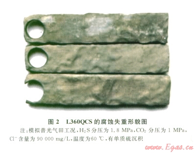室內(nèi)模擬試驗(yàn)表明L360QCS低合金管材在普光氣田高含硫工況下的腐蝕速率較高,特別是有單質(zhì)硫沉積以后,將出現(xiàn)極高的腐蝕失重?,F(xiàn)場監(jiān)測、檢測表明集氣站內(nèi)管道盡管有單質(zhì)硫沉積,但通過定期清管清除單質(zhì)硫及腐蝕產(chǎn)物、同時實(shí)施預(yù)涂膜+連續(xù)緩蝕劑加注等防腐措施,將均勻腐蝕速率控制在0.076mm/a,服役后開管檢查管內(nèi)壁幾乎沒有腐蝕,智能清管也只檢測到有個別局部腐蝕,表明緩蝕劑添加對管線起到了很好的保護(hù)作用。