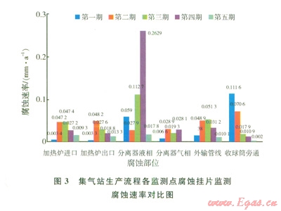 普光氣田從2009年10月投產(chǎn)至今,掛片數(shù)據(jù)顯示集輸和凈化系統(tǒng)腐蝕處于較低水平,整體受控(圖3),集輸站場內(nèi)管線和集輸管道平均腐蝕速率基本控制在0.076 mm/a以內(nèi)。其中集輸系統(tǒng)腐蝕較為嚴(yán)重的部位集中在:集氣站場計量分離器氣相和液相部位、收球筒旁通、計量匯管(生產(chǎn)匯管)集輸管道低洼處等存在積液和沉積物的位置。