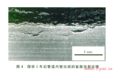 取樣結(jié)果顯示,管材內(nèi)表面無SSC裂紋,僅有少量氫鼓泡,管壁內(nèi)部無氫致開裂裂紋(圖4),也就是說在高含硫工況下環(huán)境開裂問題不嚴(yán)重,管材服役性能良好。