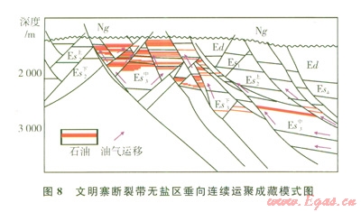 該成藏模式主要分布于無鹽巖發(fā)育的復(fù)雜斷裂帶,屬于常壓環(huán)境油氣藏的油氣成藏模式類型。這種模式油氣藏的油氣主要是在浮力作用下沿?cái)嗔严蛏线B續(xù)運(yùn)移。以文明寨地區(qū)為代表(圖8)。該成藏模式具有如下特點(diǎn):①具有沙三上、中、下亞段3套烴源巖供烴;②以垂向連續(xù)運(yùn)移為主,側(cè)向運(yùn)移為輔;③圈閉類型主要為斷塊圈閉;④運(yùn)移動(dòng)力主要是浮力;⑤縱向上烴類聚集層系沿主干斷裂呈羽狀分布。