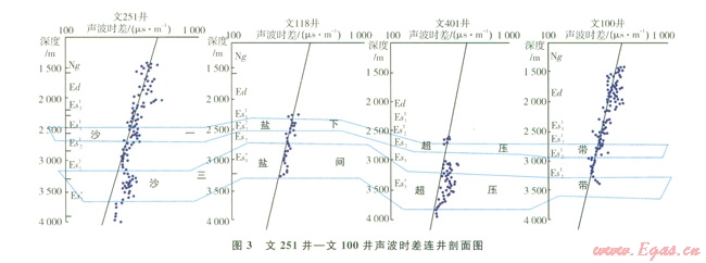 文251井-文100井剖面橫跨西部洼陷、文留主體和東部洼陷,在文留主體和兩側(cè)洼陷斜坡帶發(fā)育沙三2鹽、沙三4鹽和沙一鹽。從聲波時(shí)差對(duì)比剖面圖(圖3)上可以看出,西部洼陷斜坡帶的文251井、東部洼陷斜坡帶的文100井、文留主體的文118井,以及新文401井主要發(fā)育沙三鹽間超壓帶和沙一鹽下超壓帶,在橫向上具有較好的對(duì)比性,且沙三鹽間超壓帶的超壓幅度明均大于沙一鹽下超壓帶,東、西洼陷斜坡帶的超壓幅度均大于文留主體,說明在異常壓力的動(dòng)力下,洼陷區(qū)生成的油氣可以向構(gòu)造主體運(yùn)移,也可以由沙三段向淺部的沙二段和沙一段運(yùn)移。