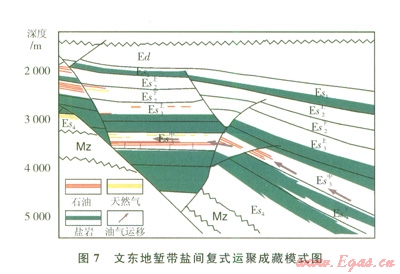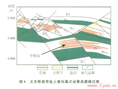 屬于鹽上油氣藏的油氣成藏模式類型。斷裂帶下部鹽間或鹽下地層中的砂體是油氣幕式運(yùn)移的臨時(shí)倉儲(chǔ)層或“中轉(zhuǎn)站”,由于下部流體的超壓作用,這些砂體中的流體沿?cái)鄬又芷谛葬尫哦鴮⒂蜌獯罅哭D(zhuǎn)移到上部地層。主要發(fā)生于斷裂活動(dòng)期,具有早期充注的特點(diǎn),以衛(wèi)城地區(qū)向南至文留地區(qū)為代表(圖6)。該成藏模式具有如下特點(diǎn):①具有沙三上、中、下亞段3套烴源巖供烴;②以垂向幕式運(yùn)移為主、側(cè)向運(yùn)移為輔;③圈閉類型主要為復(fù)雜斷塊圈閉;④運(yùn)移動(dòng)力主要是超壓;⑤縱向上烴類聚集層系沿主干斷裂呈羽狀分布。