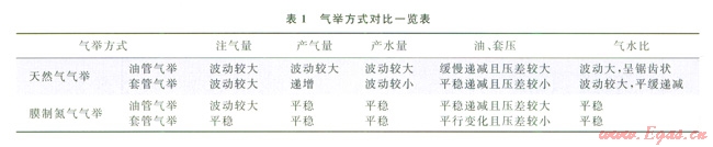 氣舉氣源主要有膜制氮氣和天然氣[7]。鄰井有高壓氣的井選天然氣氣舉,鄰井沒有高壓氣的井選擇膜制氮氣氣舉。膜制氮氣氣舉比天然氣氣舉在注氣量、產(chǎn)氣量、產(chǎn)水量等方面更平穩(wěn)(1)