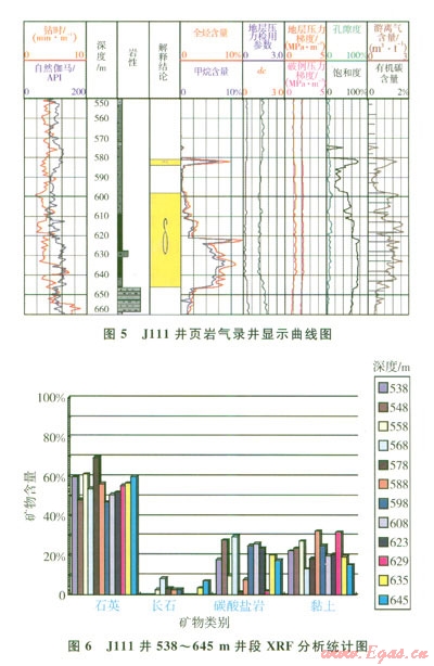 井段598.0646.0 m巖性主要為灰黑色頁巖、泥巖,含砂,硬且脆,頁巖頁理與粒間孔發(fā)育,且孔隙間相互連通,有明顯油味。XRF分析顯示石英含量為47.0%60.0%(6),硅鈣脆性礦物成分平均含量為80.0%;黏土含量為l5.0%30.0%(平均含量為20.0%)。黏土成分中伊利石平均含量為30%、高嶺石平均含量為20%。全烴含量由0上升到9.85%C1含量由0上升到8.14%,C2含量由0上升到1.O9%,C3含量由0上升到0.31%,iC4含量由0上升到0.04%,nC4含量由0上升到0.08%;鉆時(shí)比值為1.52.0,烴對比系數(shù)為20197,氣測孔隙度為3.0%6.5%,氣測含烴飽和度為59.3%79.3%,氣測滲透率為0.33.2 mD。隨鉆地層壓力檢測顯示無異常壓力存在,地層壓力梯度l.07 MPa/100 m,即靜水壓力梯度,地層破裂壓力梯度為2.2 MPa/100 m。有機(jī)碳含量最大為1.6%,平均為1.2%,地層總含氣量為2.8 m3/t,游離氣含量不低于1.3 m3/t。綜合解釋為孔隙微裂縫型頁巖氣層,預(yù)測產(chǎn)能為2 00015 000 m3/d。