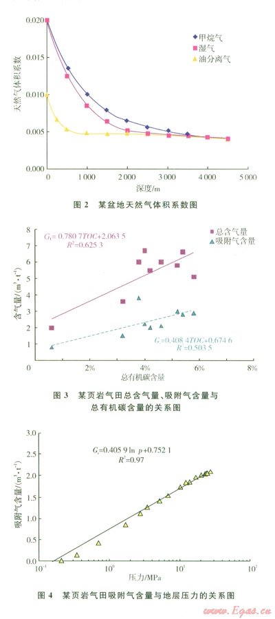 頁巖氣儲(chǔ)層吸附氣含量與總有機(jī)碳含量存在較強(qiáng)的線性相關(guān)(3),與地層壓力存在較強(qiáng)的非線性相關(guān)(4),基本符合蘭格繆爾等溫吸附方程。