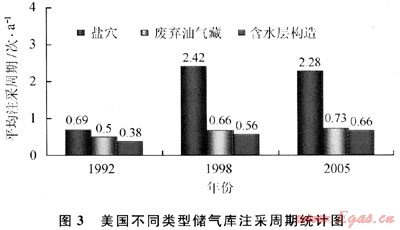 根據(jù)調(diào)研數(shù)據(jù)廢棄油氣藏儲(chǔ)氣庫(kù)注采周期一般1次/a,平均不足1次/a;含水層構(gòu)造儲(chǔ)氣庫(kù)注采周期一般1次/a,個(gè)別的會(huì)達(dá)到2次/a,如北美地區(qū)51座含水層構(gòu)造儲(chǔ)氣庫(kù)只有4座注采周期為2次/a,但平均不足1次/a。鹽穴儲(chǔ)氣庫(kù)至少1次/a,平均會(huì)達(dá)到2次/a。圖3給出的1998、1992和2005年美國(guó)在運(yùn)不同類型儲(chǔ)氣庫(kù)注采周期統(tǒng)計(jì)。從中也可以看出鹽穴儲(chǔ)氣庫(kù)循環(huán)能力最好;廢棄油氣藏儲(chǔ)氣庫(kù)循環(huán)能力不斷提高。2005年鹽穴儲(chǔ)氣庫(kù)的平均注采周期為2.28次/a,枯竭型儲(chǔ)氣庫(kù)0.73次/a,水層型儲(chǔ)氣庫(kù)0.66次/a。