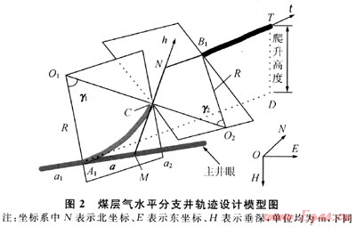 煤層氣水平分支井技術(shù)通過將主井眼和分支井眼部署在同一產(chǎn)層,在水平段主體井眼兩側(cè)側(cè)鉆分支來增加煤層的橫向動用程度,以此提高煤層氣井的開發(fā)效率。在國外,已開發(fā)出專門用于煤層氣水平分支井的軌跡設(shè)計軟件,并取得了很好的應(yīng)用效果;而國內(nèi)對煤層氣水平分支井的研究雖已取得了一定進展,但仍有待于發(fā)展和完善。截至目前,國內(nèi)有關(guān)分支爬高高度和工具造斜率約束下煤層氣水平分支井軌跡設(shè)計的文獻尚未見報道,加之國外對其設(shè)計方法和模型算法尚未公開,限制了煤層氣水平分支井技術(shù)在我國的進一步推廣和應(yīng)用。