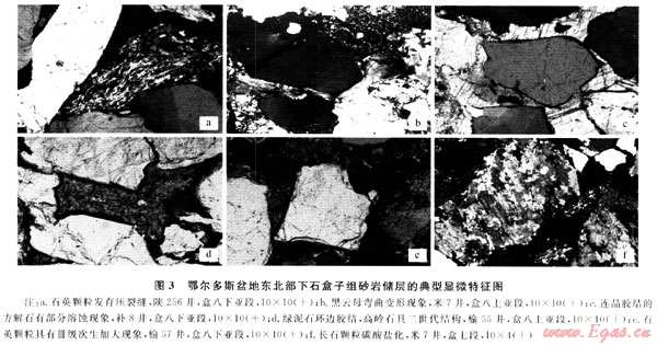 由世代膠結(jié)物充填之后余下的孔隙直徑大于0.01mm的粒間孔隙,這類(lèi)孔隙是鄂爾多斯盆地東北部?jī)?yōu)質(zhì)天然氣儲(chǔ)層的主要孔隙類(lèi)型之一(圖1-a、b)。