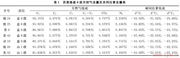 具體證據為:①盒8段與下伏烴源巖發(fā)育的山西-本溪組的氣層壓力仍基本相似,均屬于異常低壓;②盒8段儲層含氣飽和度與地層壓力系數的關系也不明顯;③該區(qū)內盒8段天然氣組成和碳同位素與下伏山西組基本相似(表1)。