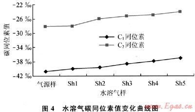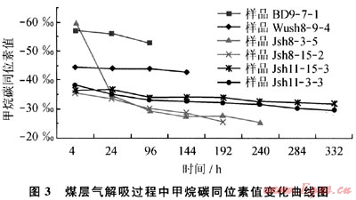 2) 通過甲烷在解吸吸附過程中碳同位素的分餾效應,可以判斷煤層氣成藏過程。在煤層氣開發(fā)過程中,可以建立某一區(qū)塊煤層氣開發(fā)井的甲烷碳同位素值的標準變化曲線,從而根據(jù)開發(fā)井甲烷碳同位素的值來判斷煤層氣井的開發(fā)狀態(tài)及采收率。
