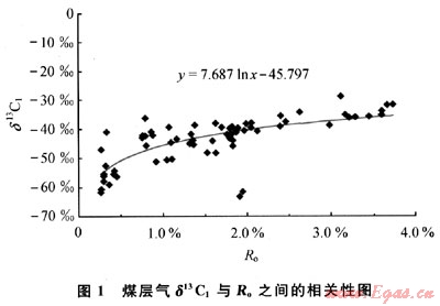 甲烷碳同位素值(δ13C1)特征是判識天然氣成因類型和演化程度的最有效的方法之一[1~5]。前人利用甲烷碳同位素來進行天然氣的演化和氣源、烴源巖的對比研究,認為:δ13C1隨著烴源巖成熟度的增大而逐漸變重,提出了煤型氣δ13C1與演化程度Ro之間關系的數(shù)學模型[6]。這些成果對于煤層氣δ13C1的研究具有一定的借鑒意義,但又不同于自生自儲的煤層氣。因此,煤層氣δ13C1的分布特征和分餾機理有待于進行進一步的分析。筆者通過對我國不同盆地、不同演化程度的煤儲層中產(chǎn)出的煤層氣樣品δ13C1實測值,在煤層氣物理模擬實驗的基礎上,研究煤層氣δ13C1的分餾效應。