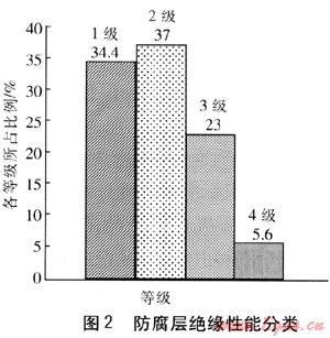 對(duì)鋼管防腐層絕緣性能檢測(cè)采用變頻選頻法,儀器采用Bs508多功能型絕緣電阻測(cè)量?jī)x,共測(cè)量106處。根據(jù)檢測(cè)結(jié)果,防腐層絕緣性能按照絕緣層電阻分類,見圖2。為了準(zhǔn)確確定埋地管道防腐層的破損點(diǎn),采用交流電位梯度法(皮爾遜法)[1~2]進(jìn)行防腐層破損點(diǎn)檢測(cè)和定位,共檢測(cè)和定位56處破損點(diǎn)。按照破損點(diǎn)的大小分類,大破損點(diǎn)2處,中破損點(diǎn)22處,小破損點(diǎn)32處。